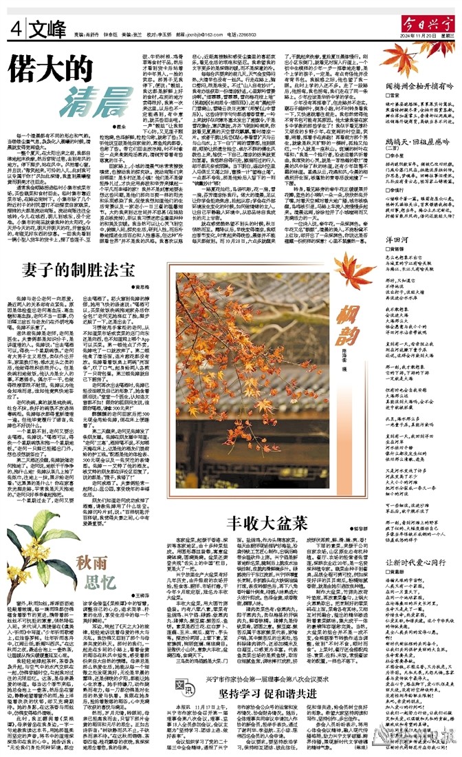 耳边,响起了《天之大》的旋律,轻轻地诉说着母爱的伟大与无私。我仿佛又回到了那个与母亲共度的秋天。那时的我们,一起走在乡间的小路上,看着金黄的稻谷在秋风中摇曳,感受着那份来自大自然的馈赠。母亲总是那么热爱生活,她能从每一个细微之处发现美好,无论是早晨的露珠,还是傍晚的夕阳,都能让她心生欢喜。她手持镰刀,动作娴熟而有力,每一刀都仿佛是对生活的热爱与执着。我跟在她身后,捡拾着散落的稻谷,心中充满了收获的喜悦与满足。