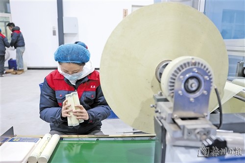 在灵台县独店镇张鳌坡村一家艾草生产加工企业,工人在生产线上作业(11月20日摄)。