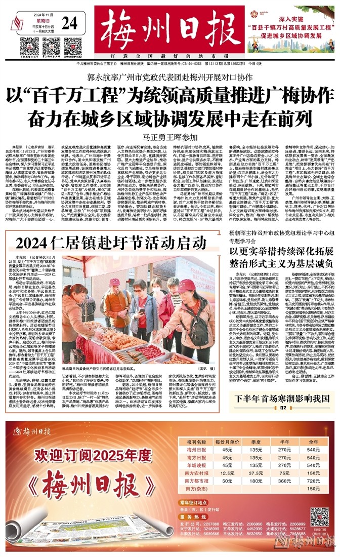 本报讯 (记者罗诚浩 通讯员史伟宗)11月23日,广州市委书记郭永航率广州市党政代表团赴梅州市,全面贯彻党的二十届三中全会精神,深入学习贯彻习近平总书记视察广东重要讲话重要指示精神,认真落实省委、省政府部署要求,推动两市对口协作工作。梅州市委书记、市人大常委会主任马正勇,市委副书记、市长王晖参加。