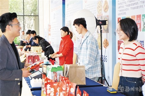 除了会场内“知识点”满满、掌声不断,场外部分企业代表也在用行动“答卷”、十分热闹。“直播间的小伙伴们,这款产品茶香浓厚,我们这边就是原产地,真的非常好喝。来,3、2、1,上链接”……在会场外专门设立的梅州特色产品展区,不少企业的主播直接搭建起直播间现场带货,吸引了不少目光。