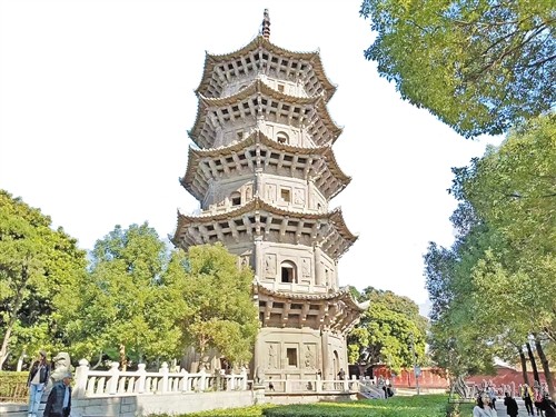 耸立在东西广场的镇国塔、仁寿塔,被俗称东塔、西塔。它们巍峨壮观,现为泉州古城的象征。东塔五层八角楼阁式石塔,高48.27米,各层分别由护栏、外回廊、塔壁、塔内回廊、八角塔心柱组成;西塔高44米,塔层、外形、内部结构与东塔相似。只是塔身石雕内容有异,如西塔雕刻了长胡子的男性观音,及《大唐三藏经诗话》中不拿金箍棒而持大刀的孙行者,引起人们的兴趣。两塔历经七百多年风雨而巍然屹立,令人惊赞。