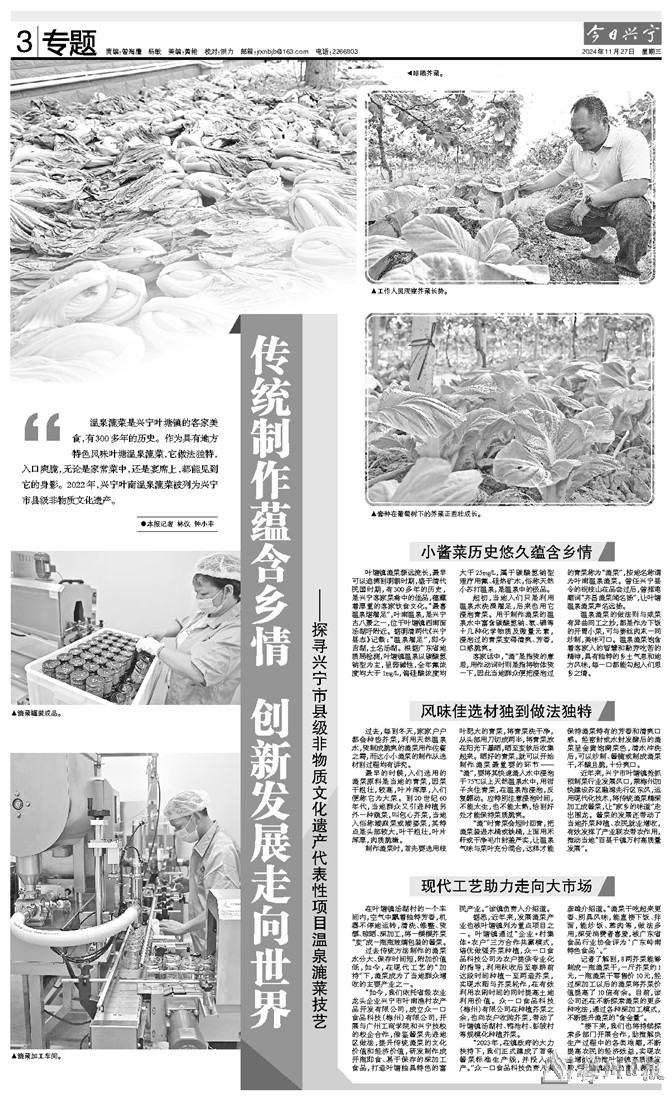 “如今,我们依托省级农业龙头企业兴宁市叶南渔村农产品开发有限公司,成立众一口食品科技(梅州)有限公司,开展与广州工商学院和兴宁技校的校企合作,借鉴酱菜先进地区做法,提升传统漉菜的文化价值和经济价值,研发制作成开瓶即食、易于保存的深加工食品,打造叶塘独具特色的富民产业。”该镇负责人介绍道。