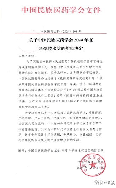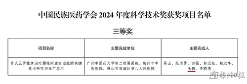 本报讯 (记者江波 通讯员宋育妮)日前,2024年度中国民族医药学会科学技术奖获奖名单揭晓,梅州市中医医院(梅州市田家炳医院、梅州市中医药科学院)王锦院长参与的“林氏正骨推拿治疗腰椎间盘突出症的关键技术研究与推广应用”获得三等奖。