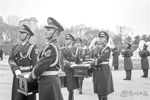 《思念曲》奏响,礼兵们抬起志愿军烈士棺椁绕广场半周,缓缓走向安葬地宫。全场人员排起长队,向烈士献花致敬。
