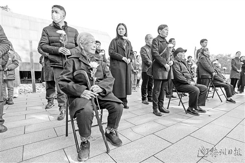 当日,南京大屠杀死难者家庭祭告活动在侵华日军南京大屠杀遇难同胞纪念馆举行。幸存者夏淑琴、刘民生、艾义英带着家人来到侵华日军南京大屠杀遇难同胞纪念馆的“哭墙”前,祭奠在87年前遇难的亲人和同胞。(新华社发)