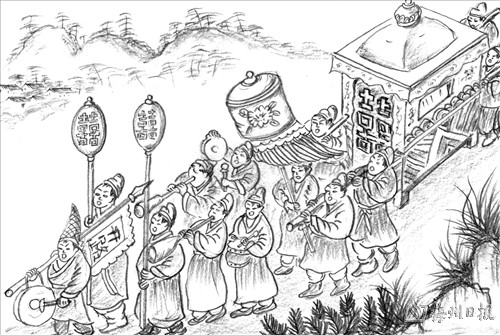 也有人家娶老婆,担鱼担鸡又担鹅。 新郎公坐四差轿,新人花轿赛嫦娥。 点评:这里说的是客家地区的婚俗。先说结婚时的盛况:“担鱼担鸡又担鹅”,说的是男方迎娶时,需挑着“鱼、鸡、鹅”等聘礼到男方,请男方亲戚吃饭喝酒,俗称“去菜”;当晚或次日凌晨,在“送亲”队伍陪伴下,点“蒸子火”送女方出阁。迎娶时新郎乘四个人抬的轿子,新娘的花轿特别漂 |