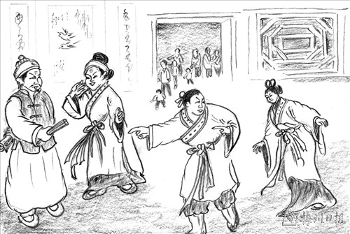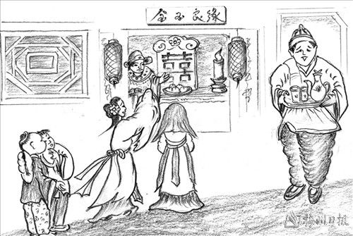 三朝拜堂分大小,谒见家官并家娘。 叔婆伯媄及姊嫂,大姑婶姆妹姨娘。 点评:结婚第三日,就要通过拜堂的形式谒见公公、婆婆、叔叔、婆婆、婶婶、姊嫂、姑嫂、姨姨等。“家官”“家娘”,客家话,指公公、婆婆。姊嫂,即妯娌。 【注:《元初一》原著:(清)林宝树,绘画:廖国勇,点评:钟德彪,注释(音):李坦生,钟旎】 |