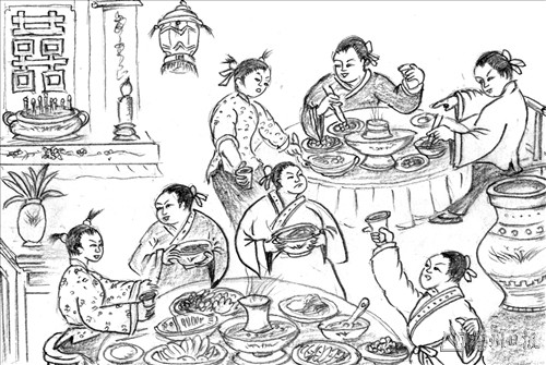 媒人相邀送嫁客,大家等接好风光。 酒筵食到下席去,就掷骰子呼令章。 点评:媒人婆也在送嫁行列,大家都列队整齐站在门口或路口,迎接新娘的到来,真是风光至极!酒席更是热闹,上席吃到下席,酒醉肉饱,还要掷骰子,比点数的大小多少作为是否喝酒、喝多少的依据哩! |