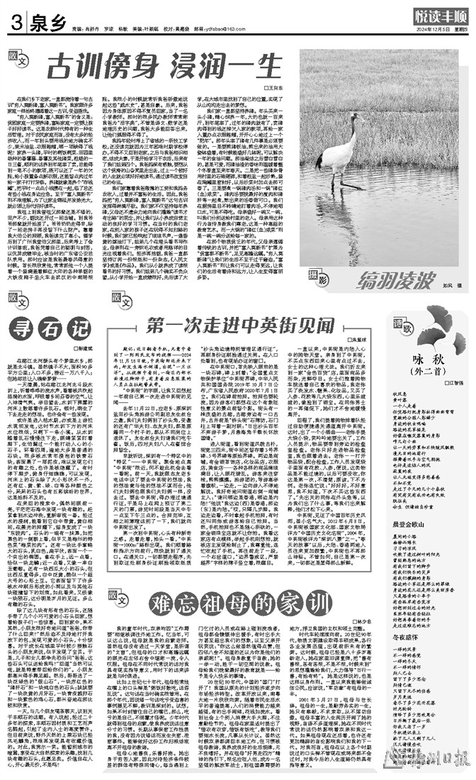 在中英街口,首先映入眼帘的是一块石碑,碑上刻着:“全国重点文物保护单位”中英街界碑,中华人民共和国国务院2019年10月7日公布,广东省人民政府2020年7月1日立。我们在碑前拍照。拍照也要轮流,因为游客们都想在这个有象征性意义的景点前留个影。街头有一株茂盛的古榕,古榕旁边有一口古井,古井前是“桥头街”石牌坊,石门柱上写着一副对联:“日出沙头百年不弃游子梦,月悬海角千载长怀故国情。”