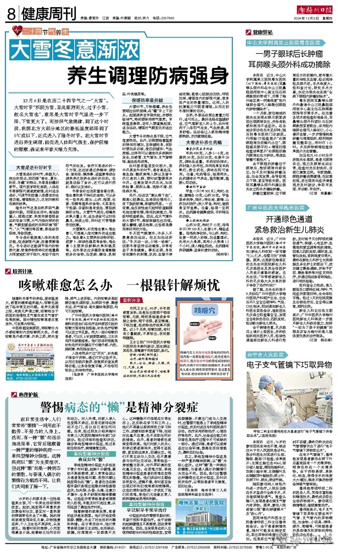 12月6日是农历二十四节气之一“大雪”。大雪时节“积阴为雪,至此栗烈而大,过于小雪,故名大雪也”,意思是大雪时节气温进一步下降,下雪更大了。而按照气象规律,到了这个时段,我国北方大部分地区的最低温度都降到了0℃或以下,正式进入了隆冬时节。在大雪时节进行养生调理,能促进人体阳气萌生,保护阴精的潜藏,保证来年春天精力充沛。