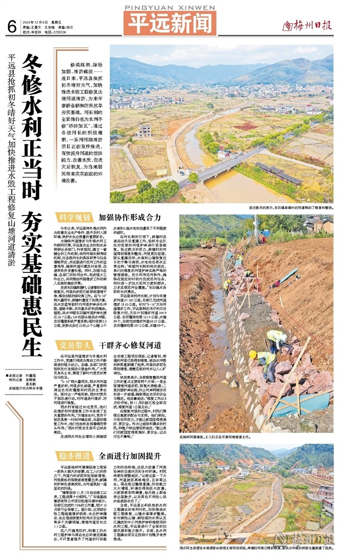 修堤筑坝、除险加固、清淤疏浚……连日来,平远县抢抓初冬晴好天气,加快推进水毁工程修复山塘河道清淤,为来年春耕备耕和防汛抗旱夯实基础。河长制的全面推行也为水利冬修“添砖加瓦”,通过各级河长的积极履职,一系列河湖清淤项目正在有序推进,有效提升河道的泄洪能力,改善水质,促进灾后恢复,为当地居民带来实实在在的环境改善。