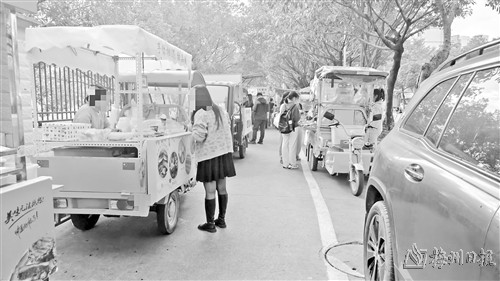 本报讯 (记者陈坚平)近日,有市民向本报《民生一线》栏目反映称,位于梅县区大新西路的嘉应学院程江校区门口,流动摊贩占道经营现象和车辆乱停放较为严重,不仅影响车辆和行人的正常通行,也影响市容市貌。