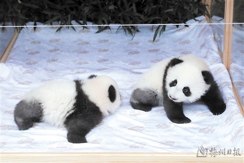 这是12月6日在德国柏林动物园拍摄的大熊猫双胞胎“梦好”(左)和“梦甜”。