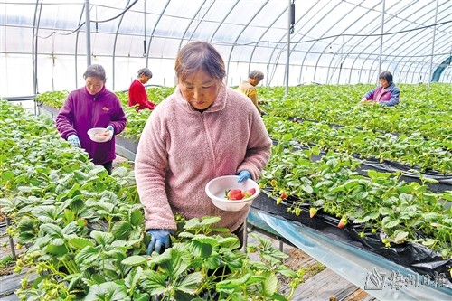 12月11日,欣苗村村民在冬暖大棚内采摘草莓。