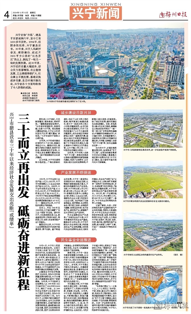 兴宁古称“齐昌”,建县于东晋咸和六年,至今已有1600多年历史。1994年,经国务院批准,兴宁撤县设市。30年来,兴宁人民踔厉奋发、砥砺前行,在这片2105平方公里的“红色苏区”热土上,掀起了一轮又一轮的发展热潮。这30年里,兴宁经济总量大幅提升,综合实力显著增强,农业蓬勃发展,工业规模持续扩大,社会事业不断发展,基础设施逐步完善,生态环境不断优化,兴宁在各个方面均取得了令人骄傲的成就。