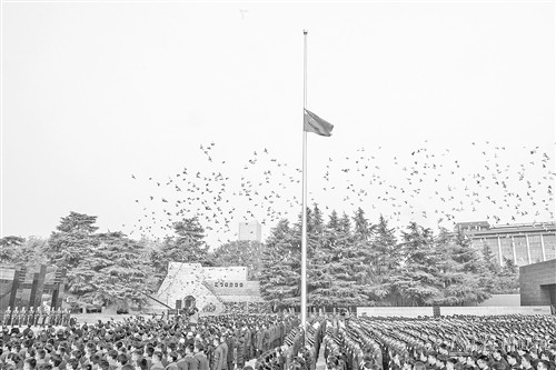 李书磊讲话后,87名南京市青少年代表宣读《和平宣言》,6名社会各界代表撞响“和平大钟”。伴随着3声深沉的钟声,3000只和平鸽展翅高飞,寄托着对死难者的无尽哀思和对世界和平的无限期许。