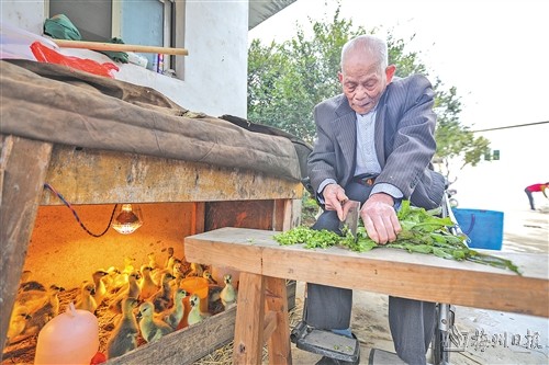 谢指南年纪虽大,腿脚不灵便,但依然目若朗星,日常生活都能自理,平时都是独自开着电动轮椅在村里转转,一会儿去菜地里看看青菜的长势,一会儿又麻利地拿起菜刀,把青菜切成细丝喂养小鹅苗。