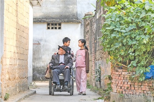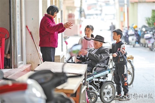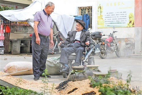 在村子一隅,百岁老人谢指南正和村民聊天,说起话来声音洪亮。只见他身着一套笔挺的西装,脚踏锃亮的皮鞋,头戴一顶精致小帽,精神矍铄。他熟练地操控着电动轮椅,每经过一户人家,都会礼貌地停下,或和他们打招呼,或闲聊几句。