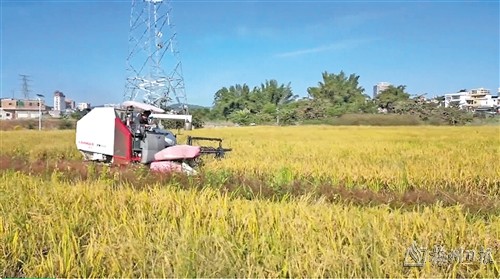 本报讯 日前,龙村镇潭溪村的晚稻迎来了丰收的季节。金黄色的稻田在阳光下闪耀着丰收的光芒,农户们正利用收割机抢收稻谷,确保颗粒归仓。