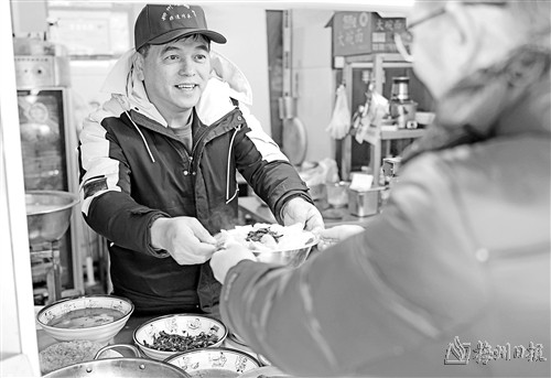 近日,柳州螺蛳粉制作技艺非遗传承人陈伟在自家店内为顾客端上螺蛳粉。