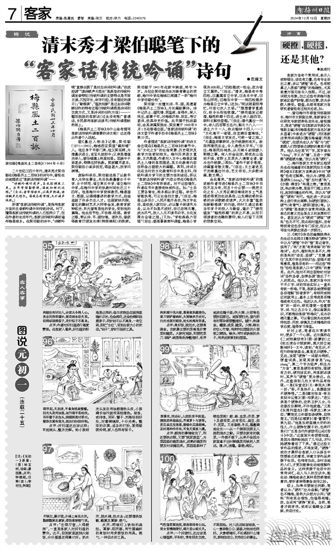 二十世纪三四十年代,清末秀才梁伯聪在《梅县风土二百咏》的诗句中,曾经生动地描述过“客家话传统吟诵”——