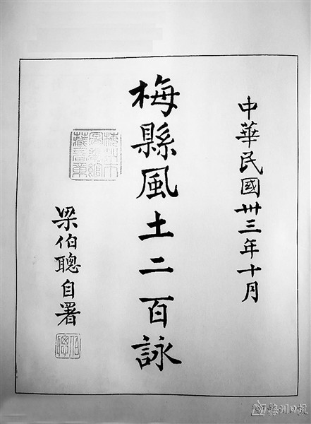 梁伯聪一生擅长诗、书、画,其遗著《梅县风土二百咏》,为长篇叙事诗。诗中记风土、道民情、观鉴戒、言得失,深入浅出,叙事千年,对梅县风物、故实,考订甚详,极具存史价值。此书撰于抗战期间,由其亲属梁挺生、梁京熹于1969年9月1日在香港出版。“客家话传统吟诵”的诗文登于作者手抄本《梅县风土二百咏》第55页。