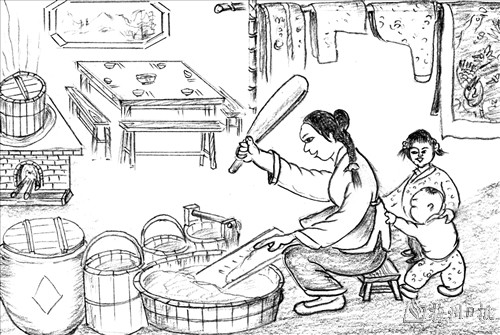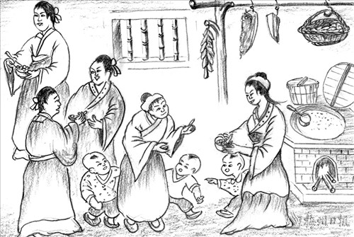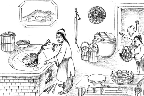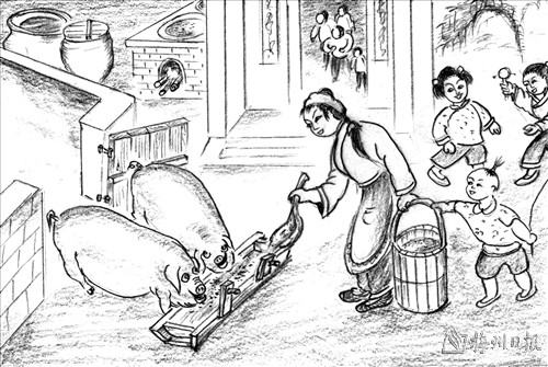 再来暖汁供大猪,青菜煮来藏浸炒。 菜刀锅铲箸碗杯,火筒锹夹齐放好。 扫光地面好颜容,捡头拾尾有常道。 点评:煮好饭,挑完水,还要煮猪食。农家最主要的菜肴是炒青菜和腌菜。大家吃饱饭,则要把菜刀、锅铲、碗筷等洗净整理好,有序地放在橱子里;吹火筒、火钳等也要放回原位。地面要扫光,屋内所有的零杂都要整理好。暖汁:热猪食。藏浸:咸菜、 |
