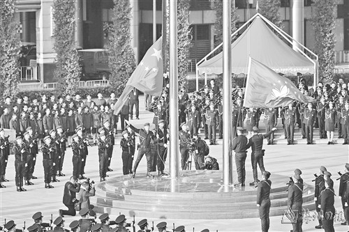 由特别行政区治安警察局特警队组成的护旗队伍分别护送中华人民共和国国旗和澳门特别行政区区旗进入广场。8时整,随着澳门警察乐队奏响《义勇军进行曲》,国旗和区旗冉冉升起,迎风飘扬。全体观礼人员面向旗帜行注目礼,高唱国歌。