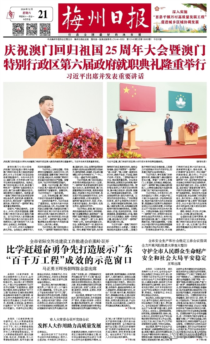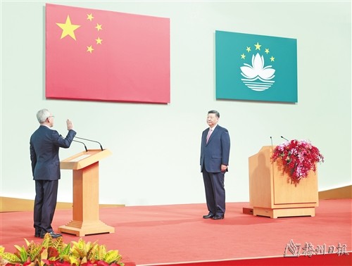 新华社澳门12月20日电 庆祝澳门回归祖国25周年大会暨澳门特别行政区第六届政府就职典礼20日上午在澳门东亚运动会体育馆隆重举行。中共中央总书记、国家主席、中央军委主席习近平出席并发表重要讲话。他指出,澳门回归祖国25年来,具有澳门特色的“一国两制”实践取得巨大成功,澳门发生翻天覆地的变化,国际影响力大幅提升。他希望,新一届澳门特别行政区政府团结带领社会各界,抢抓机遇、锐意改革、担当作为,更好发挥“一国两制”制度优势,不断开创“一国两制”事业高质量发展新局面。