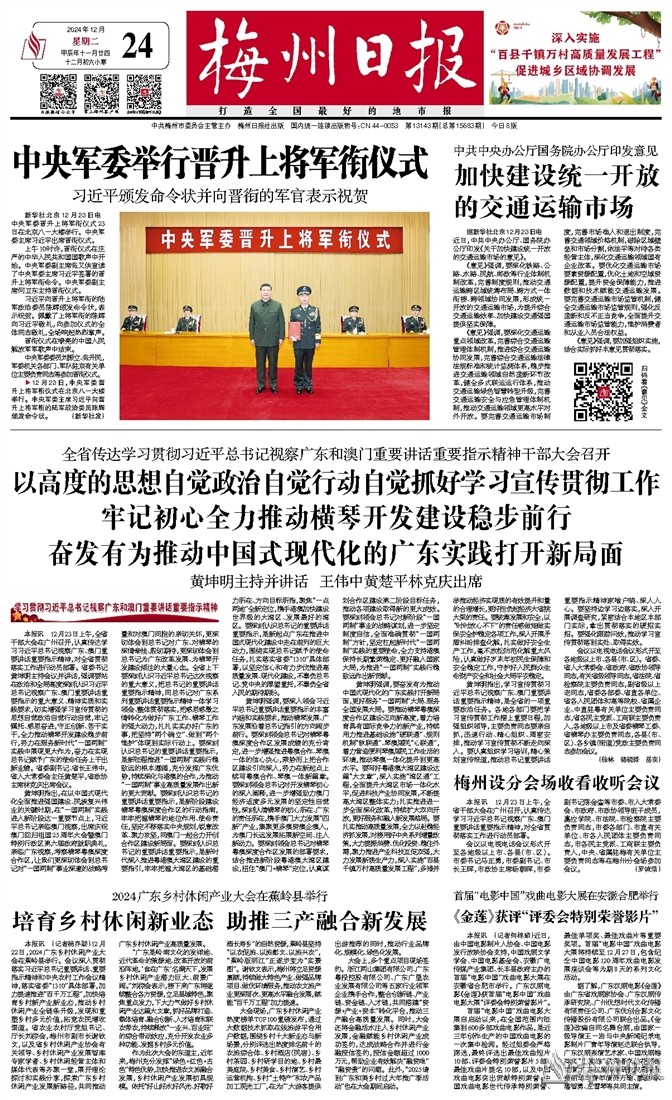 本报讯 (记者杨乔颖)12月22日,2024广东乡村休闲产业大会在蕉岭县举行。会议深入贯彻落实习近平总书记重要讲话、重要指示精神和中央农村工作会议精神,落实省委“1310”具体部署,加力提速推进“百千万工程”,加快培育乡村新产业新业态,推动乡村休闲产业全链条升级,发现和重塑乡村多元价值,拓宽农民增收渠道。省农业农村厅党组书记、厅长刘棕会,梅州市副市长谢钦文,以及省乡村休闲产业协会有关领导、乡村休闲产业发展智库专家学者、乡村休闲经营主体和媒体代表等齐聚一堂,展开理论探讨和实践分享,探索广东乡村休闲产业发展新路径,共同推动广东乡村休闲产业高质量发展。