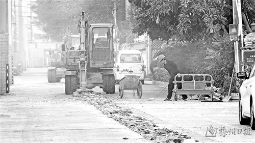 23日,记者再次来到满堂红小区看到,梅州粤海水务的施工人员已经进场施工,挖掘设备开凿路面,施工人员正在按照计划更换新自来水管(如图,陈坚平)。