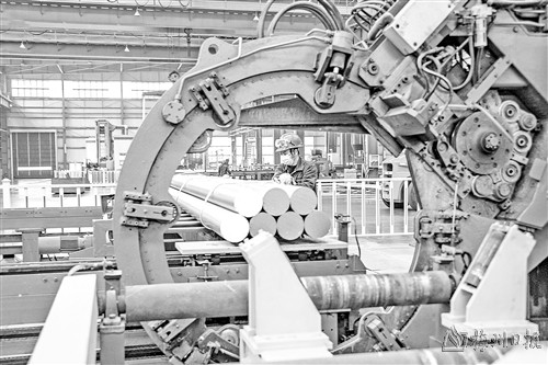 12月24日,工人在广西靖西市城北工业园区铝合金棒生产线上作业。