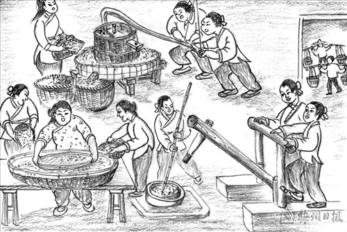 脚踏碓,手推砻,米筛簸箕件件通。 笆篮装起糠同米,糙米撮来碓臼舂。 点评:好媳妇实在难得:家中大小事情样样都得自己干!有时踏碓舂米,有时推砻碾谷,精通米筛簸箕,根本难不倒她。笆篮装着米糠,糙米还得用石臼来舂。 |