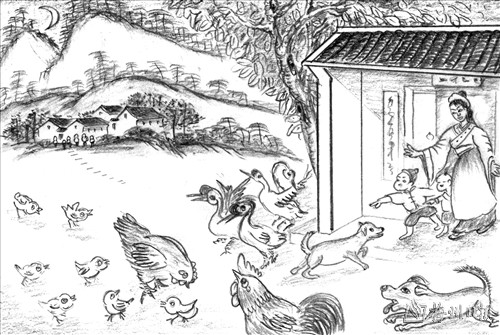 捡鸡蛋,看猫兜,鸡鸭早夜要跟收。 门前狗子吠吠吠,夜间恐怕贼来偷。 这等女人真难得,可使男人放下愁。 点评:家中的大小事情都停当了,空闲时还得捡拾鸡厩里的鸡蛋,察看一下猫窝里小猫生长情况。每天傍晚,还要跟踪鸡鸭是否悉数回家。夜深人静的时候,如果听到家中的狗子“吠吠吠”乱叫,则起床观察是否有小偷光顾。这等女人啊,实在太难得了, |