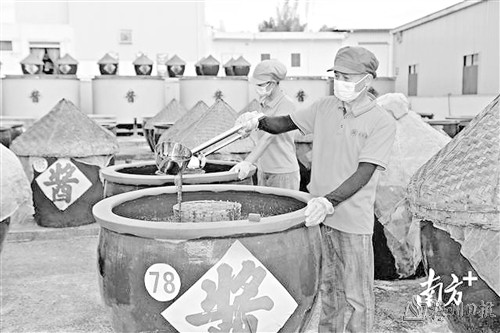 在五华县河东镇河东大道上,梅州市老聚通食品有限公司坐落在一片不大的厂房内。这里没有过多现代化装饰,但毛笔书写的“酱”字和整齐排列的200多个酱缸,却成为这里独特的风景线。