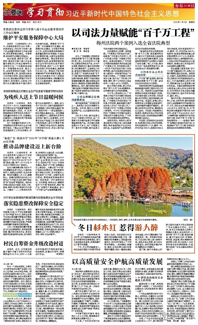 梅州市中级人民法院相关负责人介绍,近两年来,梅州法院涉农村土地速裁案件平均审理时长仅18天,判处生态环境损害赔偿1484多万元,依托“庭、站、点”机制诉前化解基层矛盾纠纷5000多件;法官下沉企业走访,加大“大埔青花瓷”地理标志产品司法保护力度,积极引导“兴宁鸽”申报地理标志……一场推动“梅字号”品牌做大做强的司法行动,为推进梅州“百千万工程”走深走实提供坚实的法律服务和保障。