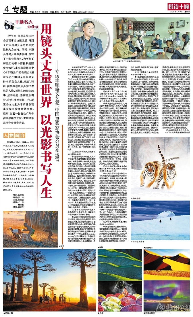 近年来,丰顺县经济社会各项事业快速发展,得到了广大外出乡亲的热切关注和大力支持。同时,丰顺县外出乡亲奋勇拼搏,涌现了一批业界精英,为更好了解他们的奋斗历程和爱国爱乡情怀,丰顺县融媒体中心(丰顺县广播电视台)组织采访小组到全国各地采访丰顺县在文化、教育、科研、商界等领域中具有代表性的人物,用他们的励志故事、成功经验、崇高品质引导、带动、激励年轻一代,凝聚各方力量为丰顺县各项事业振兴发展贡献力量。近期,记者一行前往广州专访丰顺籍文艺家、中国摄影家协会会员李迅雷。
