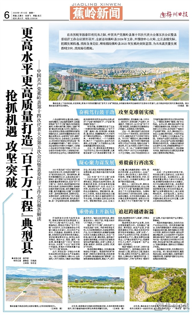 仔细研读本次党代会报告发现,清晰的蕉岭规划发展蓝图上,“百千万工程”格外引人注目。报告明确指出,要坚定不移以“百千万工程”为总抓手,以苏区融湾综合示范窗口建设为突破口,突出抓好产业根本、风貌基础、县城载体、改革关键,加强党的全面领导和党的建设,更好统筹发展和安全,保持社会和谐稳定,推动兴业、强县、富民一体发展,高质量完成“十四五”规划目标任务,为实现“十五五”良好开局打牢基础,更高水平更高质量打造“百千万工程”典型县。