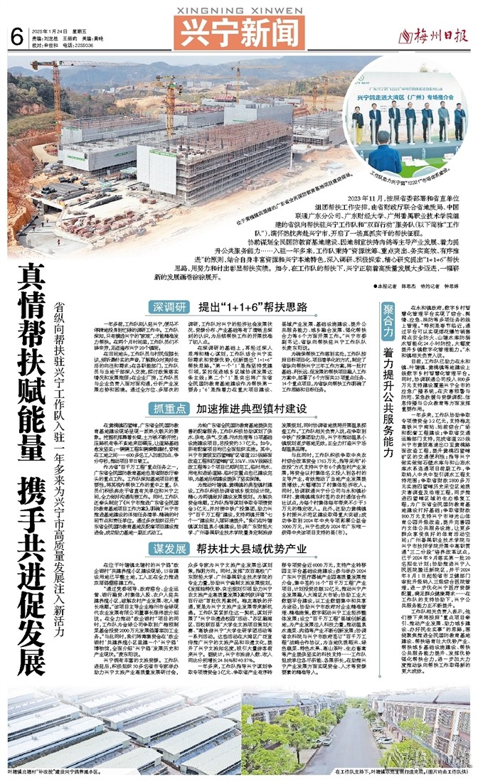 在深调研的基础上,再经过深入思考和精心谋划,工作队结合兴宁实际需求和资源优势,创新提出“1+1+6”帮扶思路。“第一个‘1’是指坚持党建引领,紧扣促进城乡区域协调发展这条主线;第二个‘1’是突出将广东省全民国防教育基地建设作为帮扶第一要务;‘6’是指着力在重大项目建设、县域产业发展、基础设施建设、提升公共服务能力、城乡融合发展、强化帮扶合力等6个方面开展工作。”兴宁市委副书记、省纵向帮扶驻兴宁工作队队长麦东阳说。