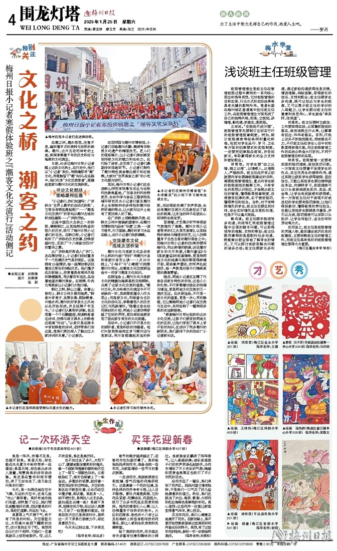 日前,60多位梅州日报小记者踏上这块文化热土,在行走中,他们以“小记者”身份,用眼睛探寻“潮”文化,用笔触留下“潮”知识;在实践中,他们化身“文化交流使者”,搭建起客家与潮州文化的交流桥梁。
