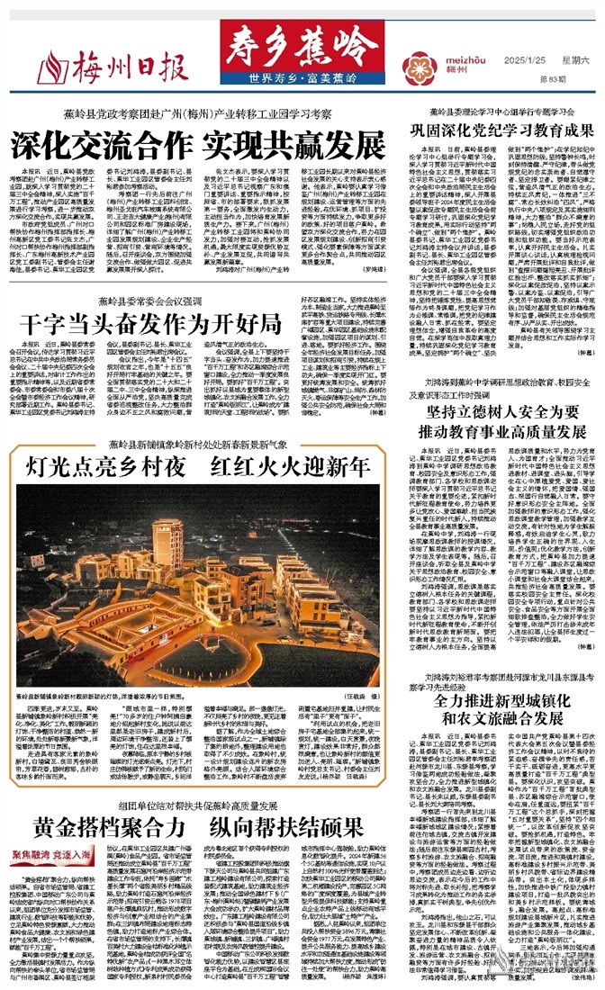“黄金搭档”聚合力,纵向帮扶结硕果。自省市场监管局、省建工控股集团、中国移动广东公司与蕉岭结成省内纵向对口帮扶协作关系以来,组团单位充分发挥市场监管、建筑行业、数智科技等职能和优势,立足蕉岭特色资源禀赋,大力推动蕉岭食品大健康、农文旅和绿色建材产业发展,结出一个个帮扶硕果,赋能“百千万工程”。