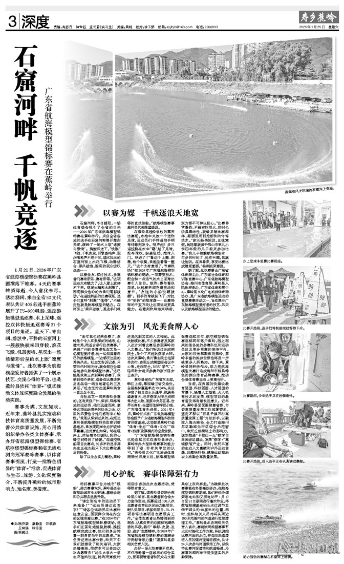 1月21日,2024年广东省航海模型锦标赛在蕉岭县圆满落下帷幕。4天的赛事转瞬即逝,令人意犹未尽。活动期间,来自全省52支代表队共计405名选手在蕉岭展开了F5-950帆船、遥控游艇模型追逐赛、水上足球、遥控双体快艇追逐赛等27个项目的角逐。蓝天下、青山间、碧波中,平静的石窟河上一艘艘快艇来回穿梭,浪花飞溅、机器轰鸣,呈现出一场场精彩纷呈的水上版“速度与激情”。此次赛事为航海模型爱好者提供了一个展示技艺、交流心得的平台,也是蕉岭县依托“体育+”模式推动文体旅深度融合发展的生动实践。