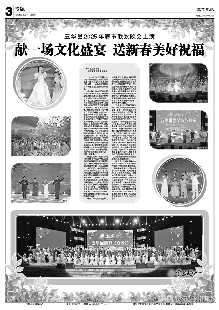 此次联欢晚会以“祥蛇贺岁 五华新韵”为主题。晚会旨在营造热闹、喜庆、祥和的春节节日氛围的同时,同时通过文化文艺力量,充分展示过去一年五华县经济社会发展、尤其是深入实施“百千万工程”取得的新成果,不断凝聚奋进力量。整场晚会共编排了12个精彩节目,形式多样,内容丰富,涵盖了歌舞、小品、朗诵、魔术等多种艺术形式,既体现了传统文化的魅力,又展示了现代艺术的创新。每个节目都巧妙地融入了五华的地方特色元素,使观众在欣赏表演的同时,也能感受到浓厚的地方文化和独特的艺术风格。为了让更多的市民群众能够欣赏到这场文化盛宴,晚会采用了“线下演出+线上直播”的形式进行传播。现场座无虚席,而未能亲临现场的观众则通过网络直播观看了整场晚会,实现了更广泛的覆盖面和社会影响力。这种线上线下结合的方式,不仅打破了地域限制,还让更多市民群众收看到这一新春文化盛宴。