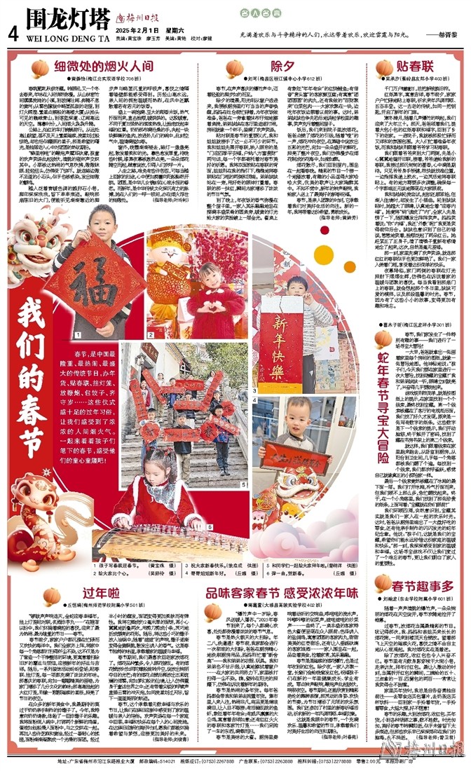 春节的乐趣,大到放烟花、收红包、买年货,小到各种琐碎之事,数不胜数。时光匆匆,美好的春节转瞬即逝,似乎未曾留下太多痕迹,但那些欢乐早已深深烙印在我们的脑海,永不消逝。(指导老师:曾卫君)