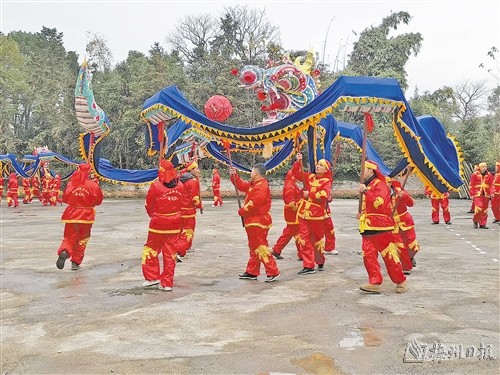 临桂区两江镇建新队在农历腊月的最后一个星期,鼓乐喧天,鞭炮齐鸣,礼花遍地,来自周边的宾客盈门。两条十多米长的青龙,游走在街头巷尾。百里以外,人们奔走相告,争相前往目睹难得一见的年俗大餐。