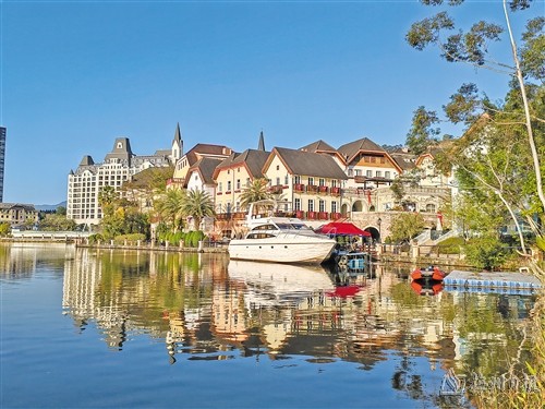小镇是借鉴著名的奥地利哈尔施塔特风格打造的。这片三面环山怀拥一湖碧水的地形地貌,开发者利用这天然的赐予,精心剥离出哈尔施塔特的代表性元素,巧妙就势,沿山腰构建错落有致的欧式别墅,在临湖的山脚仿照其风格布局小镇,将标志性的教堂和小镇广场天衣无缝嵌入其中,很得哈尔施塔特小镇的韵致。虽说仿建规模不大,湖面250多亩,一些植物也不时泄露出热带才有的种类。然而,营造者独具慧眼,精巧构思,处处彰显原小镇的风格与元素,匠心独运地嵌入万里之遥的中国,实在是令人欣喜。这对许多国人来说,足不出国即可领略阿尔卑斯山下奥地利哈尔施塔特小镇的神韵。