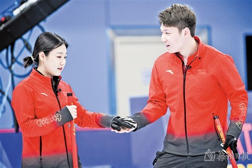 当日,在哈尔滨举行的第九届亚冬会冰壶混双循环赛B组第1轮比赛中,中国队11∶5战胜哈萨克斯坦队。 (新华社发)