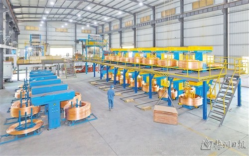 铜杆生产线忙碌作业,一块块铜板经加工变成一捆捆铜杆,随后被车辆运送到盈华电子、嘉元科技等铜箔企业,进行下一步的加工……新年伊始,位于梅州融湾产业园(广梅产业园)的晟鑫铜压延加工基地已是一派繁忙景象。