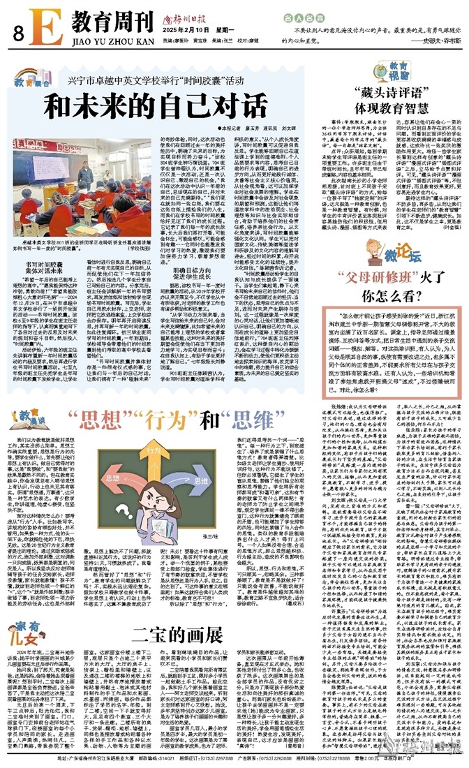 期待这样的“藏头诗评语”不妨多些,再多些,从而让我们的学生在老师们的“教育智慧”引领下不断进步,健康成长。如此,这不仅是学生之幸,更是教育之幸。 (叶金福)
