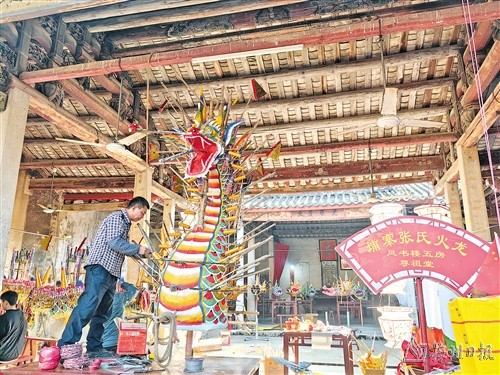 记者在埔寨镇的尊祖堂、远三和祠堂看到,“火龙”制作已基本完工,现场工作人员正在进行给“火龙”装火药等最后工序。据了解,今年元宵节,埔寨镇将有三条“火龙”闹元宵。